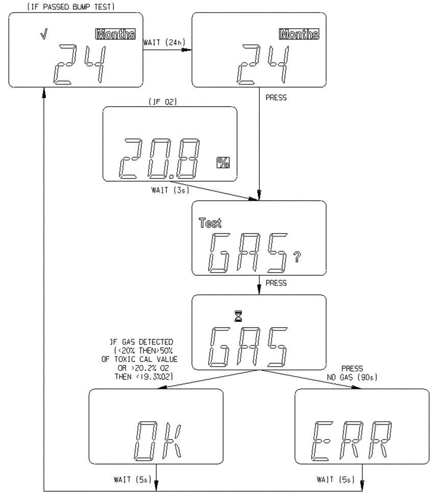 Press the TEST button again while "TEST" "GAS" "?" is displayed to activate the Bump Test mode. |